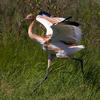 In courtship, pairs "dance," leaping into air repeatedly with flapping wings, bills pointed upward, giving bugling calls; dance has a dignified look. Other displays include bowing, tossing tufts of grass in the air, and loud trumpeting or "whooping" calls. Nest site is on ground, typically on marshy island in lake or pond. Nest (built by both sexes) is a large mound of grass, weeds, mud, with depression at center.