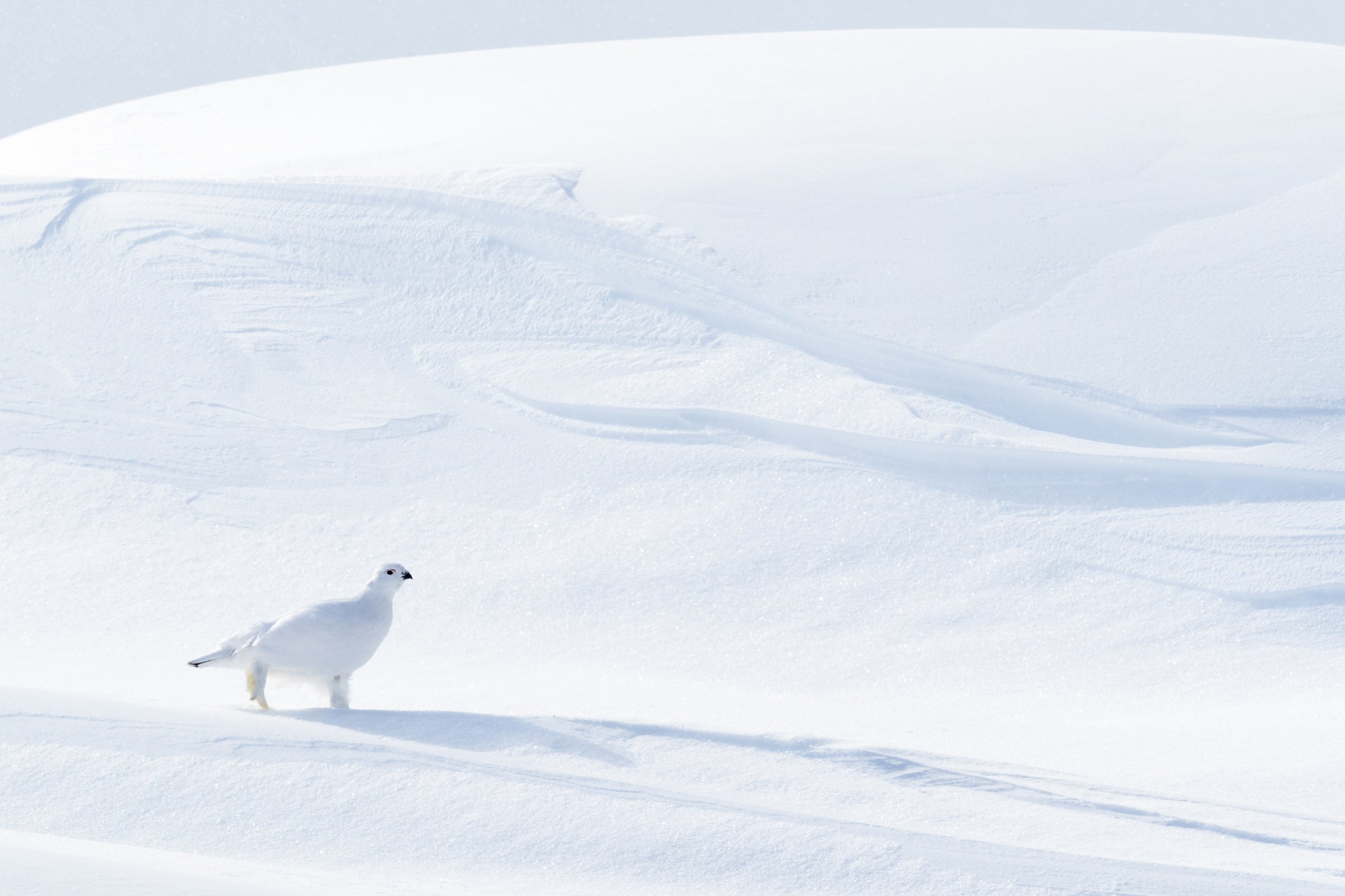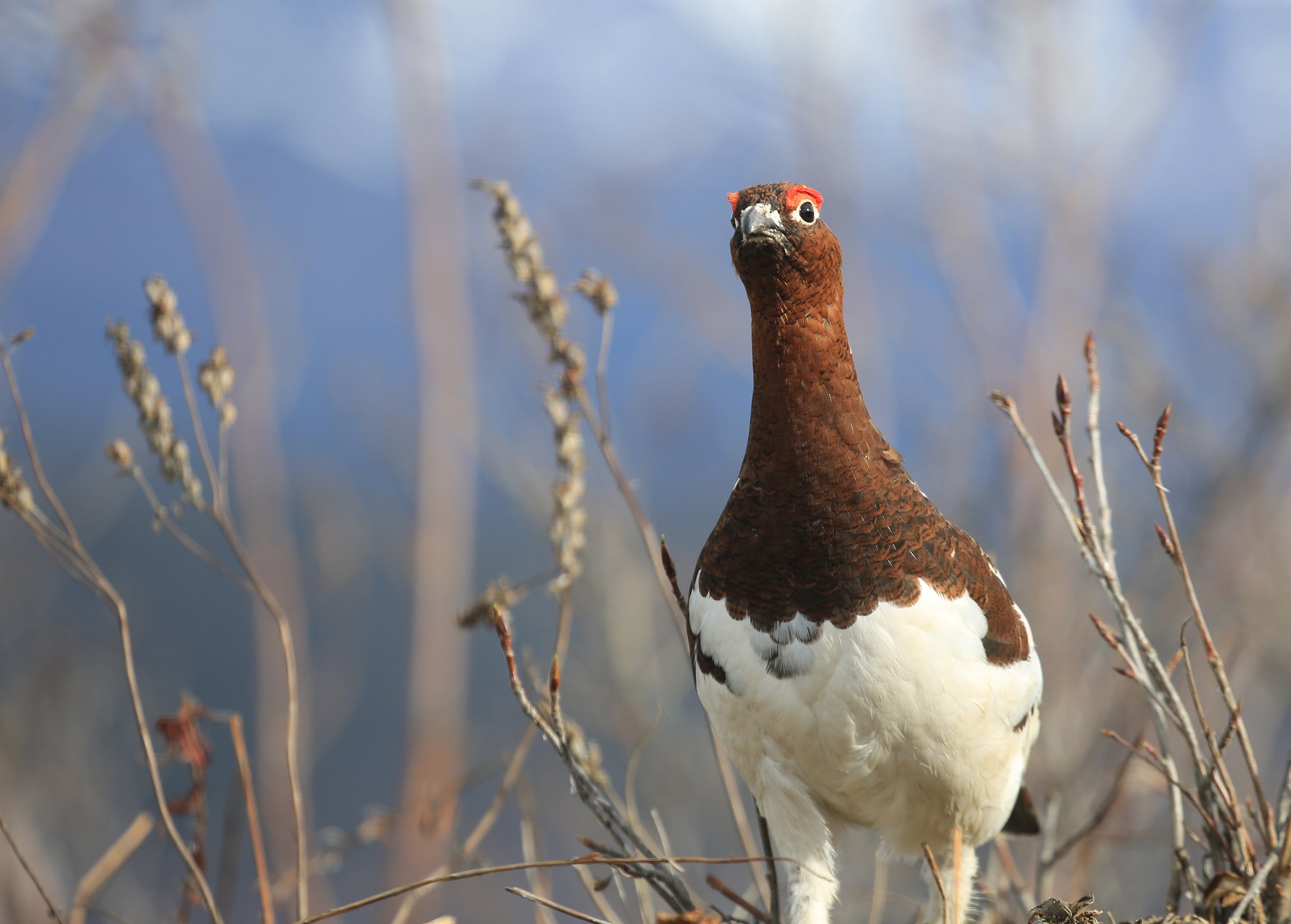 Aptly named, this common northern grouse is closely associated with thickets of dwarf willow on the tundra at all seasons. It occurs in isolated pairs at the beginning of the nesting season, but gathers in flocks in winter. Molting its body feathers twice a year, it goes from mottled brown or gray in summer to white in winter, so that it's camouflaged at all seasons. In winter its feet are heavily feathered to the tips of the toes; these feathers increase the surface area of the feet and act as 'snowshoes,' allowing the birds to walk easily over fresh drifts.