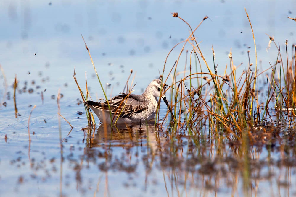Phalaropes reverse the usual sex roles in birds: Females are larger and more colorful than males; females take the lead in courtship, and males are left to incubate the eggs and care for the young. Wilson's Phalarope is an odd shorebird that swims and spins on prairie marshes. The other two species of phalaropes nest in the Arctic and winter at sea, but Wilson's is a bird of inland waters, nesting mostly on the northern Great Plains. Huge numbers may gather in fall on some salty lakes in the west, such as Mono Lake and Great Salt Lake, before migrating to South America.