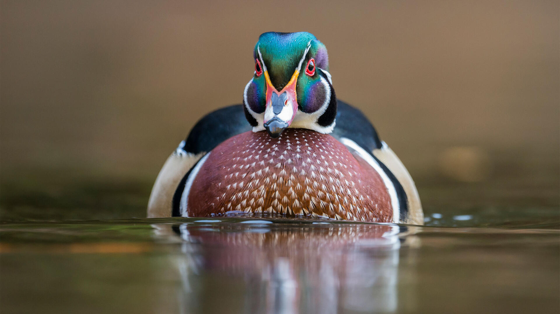 Courtship displays of male involve postures that show off colorful plumage. Nest sites are in large tree cavities near water, up to 65' above ground. Cavity lined with down. Rarely nests in hollow fallen logs, barn lofts, crevices in rocks. Uses artificial nest boxes, even when these are placed low and in open marsh.