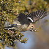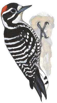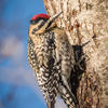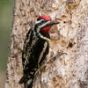 Drills tiny holes in tree bark, usually in neatly spaced rows, and then returns to them periodically to feed on the sap that oozes out. Also eats bits of cambium and other tree tissues, as well as insects that are attracted to the sap. Besides drilling sap wells, also gleans insects from tree trunks in more typical woodpecker fashion, and sallies out to catch insects in the air. Berries and fruits are eaten at all seasons, and birds may concentrate in fruiting wild trees in winter.
