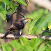 Fed by both parents. Young may leave nest and climb about in branches after about a week; can fly in about 3 weeks. In some cases, first young to leave the nest are tended by male, last ones by female.