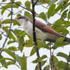 Caterpillars and other insects. Feeds heavily on caterpillars when available, including hairy types such as tent caterpillars and others; also other insects such as cicadas, beetles, grasshoppers, katydids, others. Also may eat some lizards, frogs, eggs of other birds, and berries and small fruits.