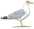25" (64 cm). Very rare visitor to northeast from Europe. Like American Herring Gull but upperparts barely darker gray, head with less dark streaking in winter, legs yellow.