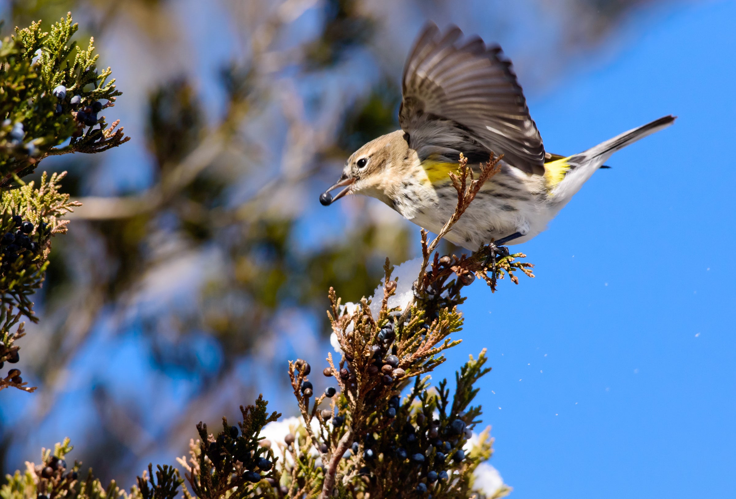 Insects and berries. Feeds on caterpillars, wasps, grasshoppers, gnats, aphids, beetles, and many other insects; also spiders. Feeds in winter on berries of bayberry, juniper, wax myrtle, poison ivy, and others. Can winter farther north than most warblers because it can digest the wax in berry coatings.
