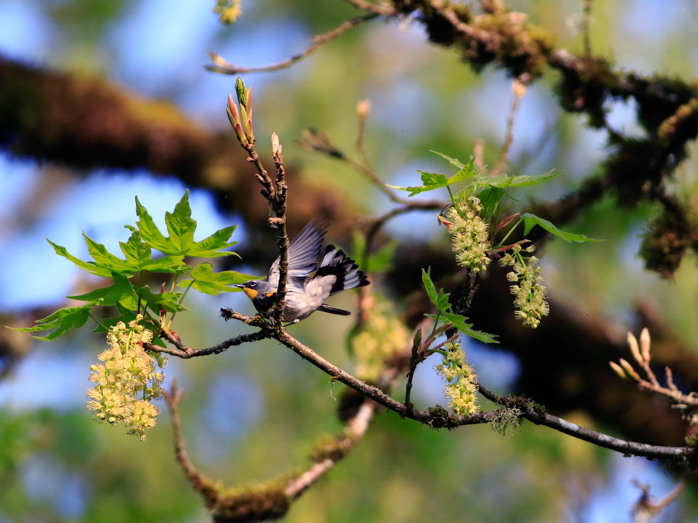 Versatile in its feeding. Searches among twigs and leaves, and will hover while taking insects from foliage. Often flies out to catch flying insects. Will forage on ground, and will cling to tree trunks and branches. Males tend to forage higher than females during the breeding season. In winter, usually forages in flocks.
