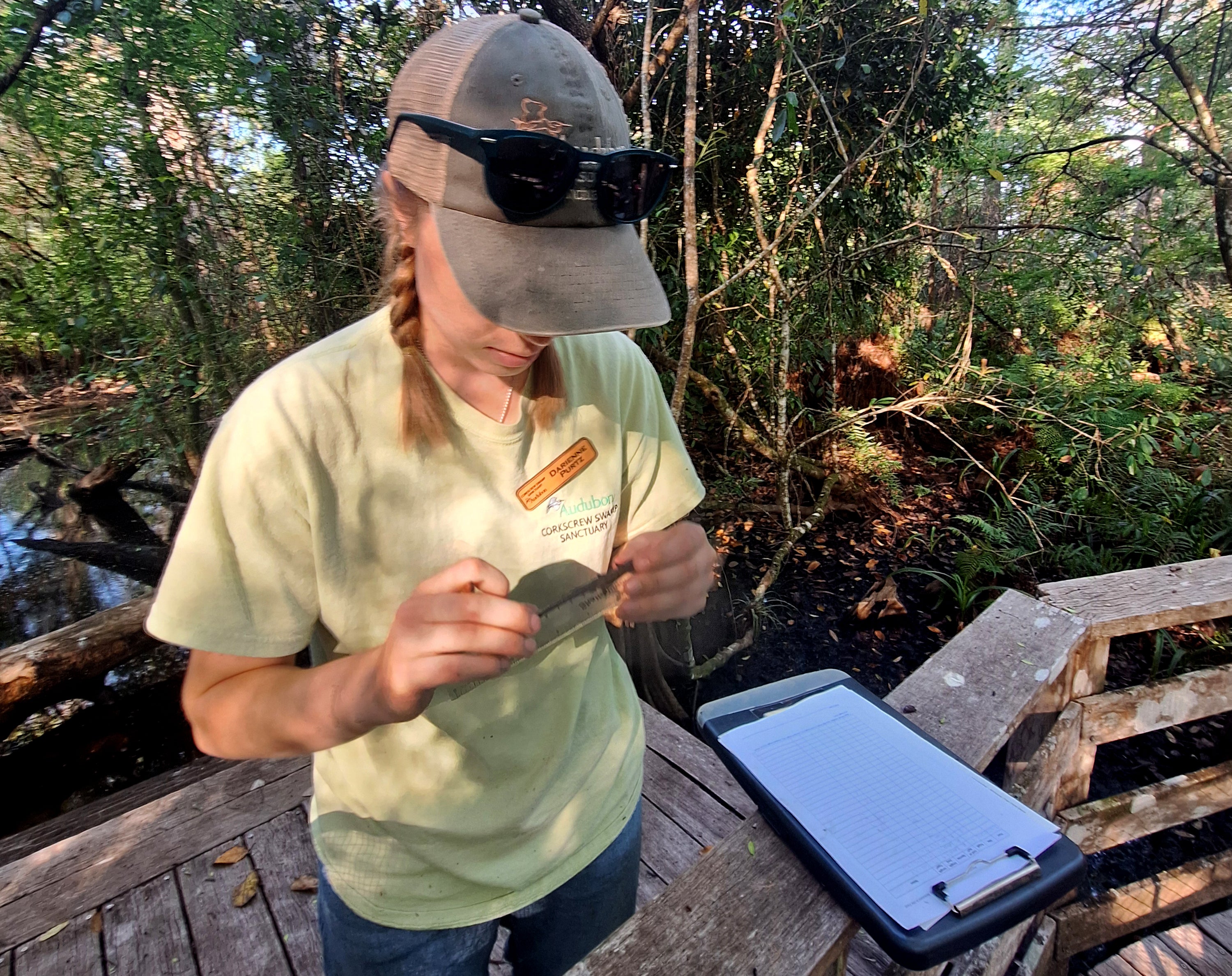 Darienne Purtz pulls a wheeled cart out of the storage shed, loads up her clipboard, boots, and other gear, and rolls it onto the boardwalk toward this week’s sample site. As a research associate for Audubon’s Corkscrew Swamp Sanctuary, Purtz typically conducts her work in the sanctuary backcountry, but today, she threads her way around curious visitors, her cart bumping over the boards. Purtz is happy for the opportunity to engage, and most visitors express appreciation for the work underway as part of the Sanctuary’s mission to collaboratively protect birds, other wildlife, and people from the unintended consequences of burgeoning development and associated human activity nearby.