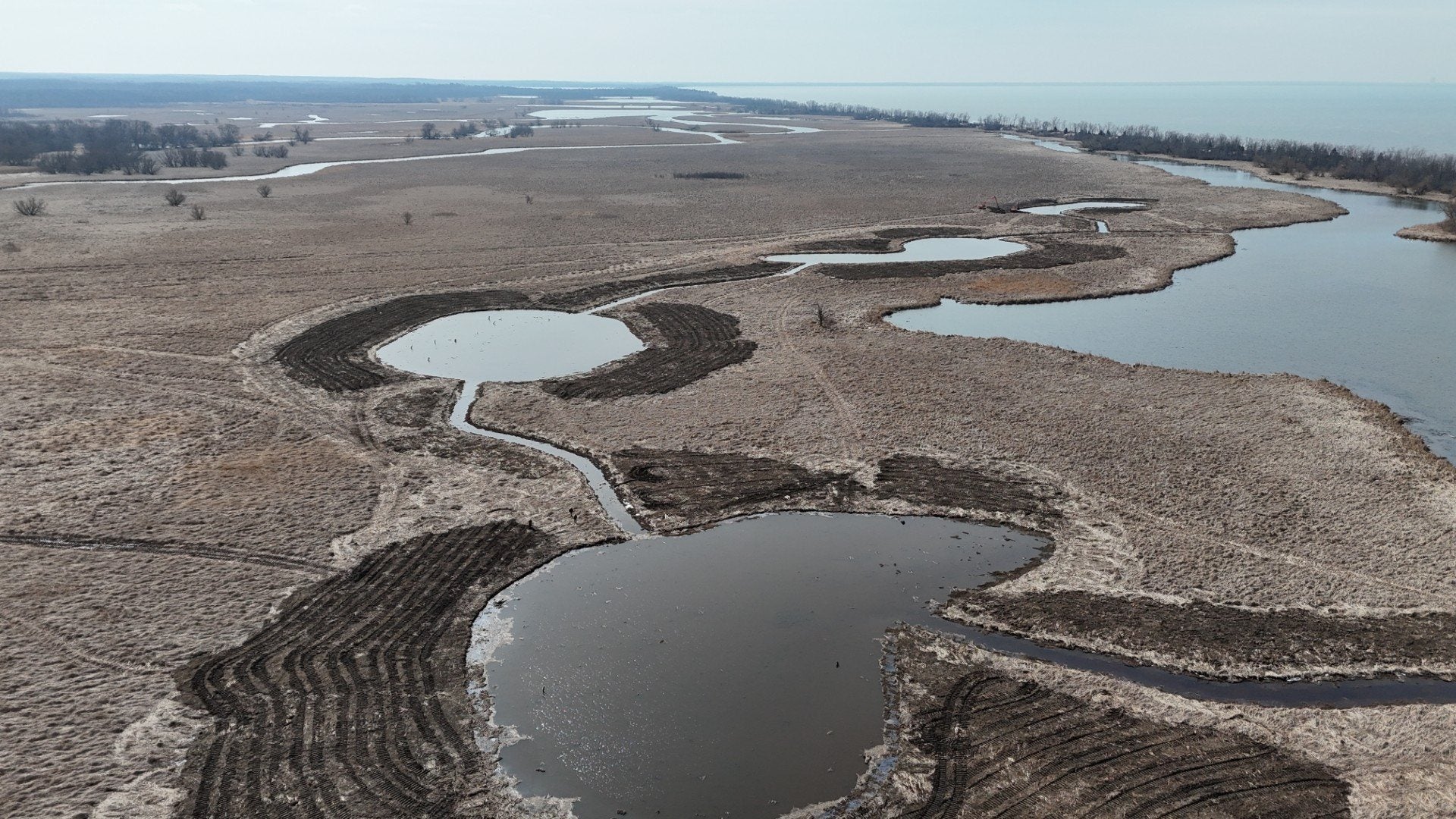 DEC partnered with National Audubon Society and DU to enhance a wetland using “channeling and potholing.” This technique improves hydrology, depth heterogeneity, interspersion of open water, and habitat connectivity to benefit spawning northern pike and other fish, as well as breeding habitat for migrating marsh birds and waterfowl in Lakeview WMA. The strategic channeling and potholing restores natural water movement and hydraulic connectivity within the marsh by using large equipment to break up dense, monoculture cattail stands and create a more diverse mix of open water and emergent vegetation.