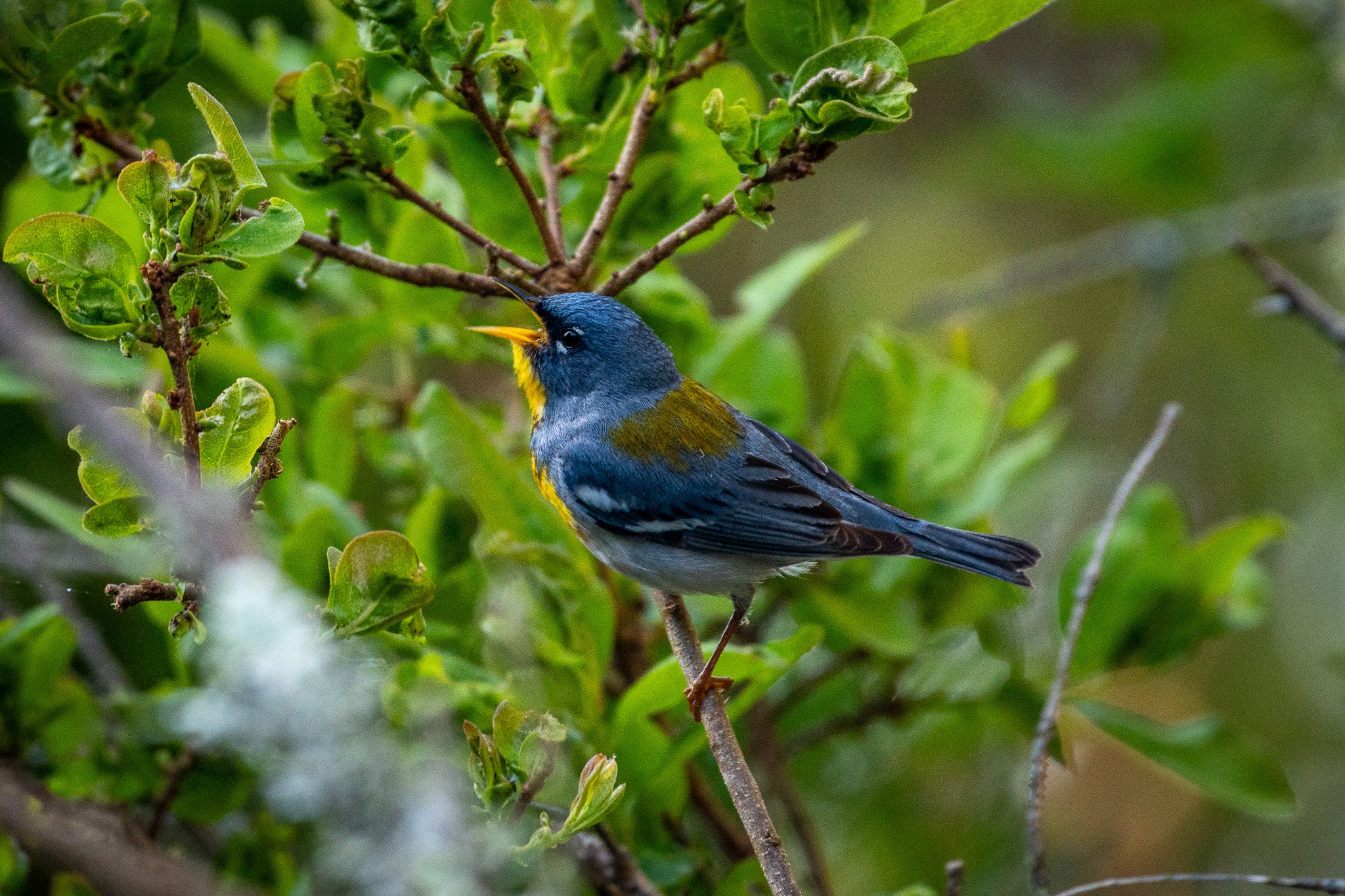 A bird perched on a branch while singing.