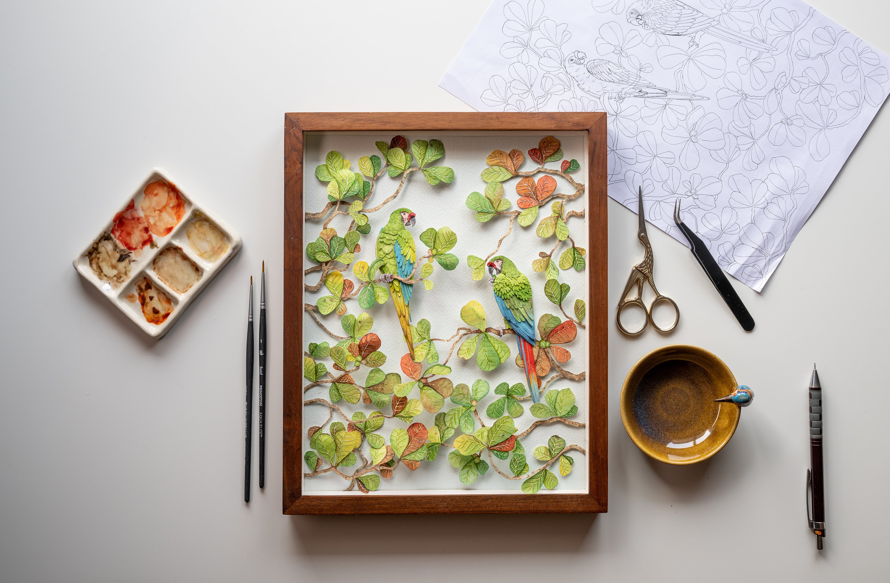 Shrimali took over to draft a sketch, then used a surgical knife to cut out all of the teeny-tiny paper pieces to conjure the birds and their habitat: feathers, beaks, leaves, twigs. Next, the shapes went back to Bird, the painter. She prefers watercolors because they have a rich matte finish and good transparency. “It really gives a good feeling to natural elements,” she says. Bird is very particular about color and only paints in natural light, which makes it difficult to work during monsoon season or even a cloudy day. “Then the studio is shut,” Shrimali jokes.