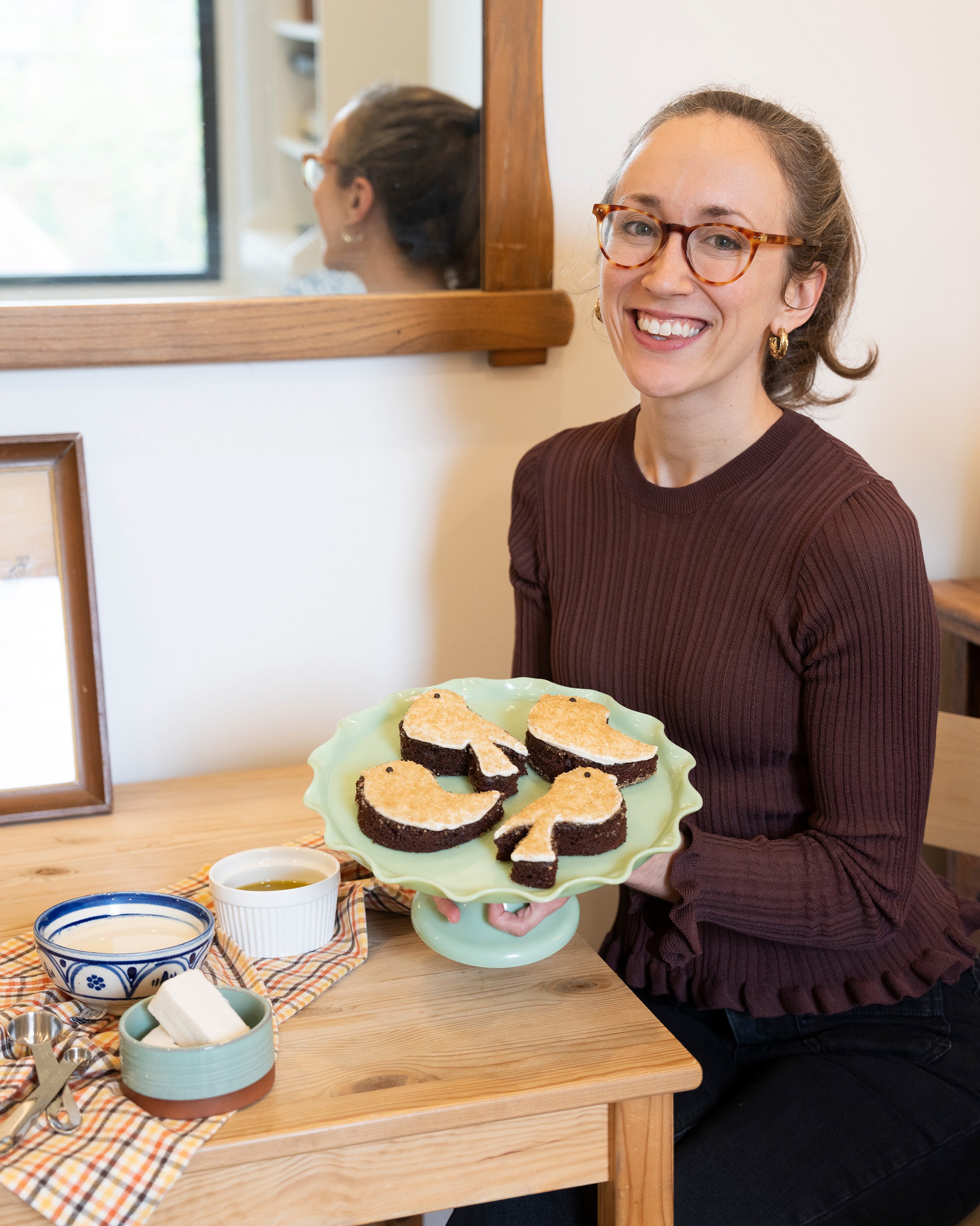 Caroline Saunders displays a fresh-baked batch of Chocolate Tahini Sweetie Cakes, made with Earth-friendly ingredients at her home in Brooklyn, New York. Photo: Sydney Walsh/Audubon