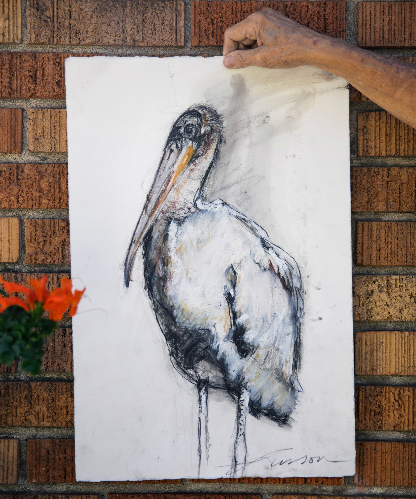 Lusson was drawn to reference photos that convey the bird’s impressive breadth—the stork with wings outstretched in flight, or proudly standing tall. “I love the stance,” she says. “It’s almost a dignified stance.” To portray the bird, Lusson started by laying out the basic figure in charcoal, erasing and redrawing as needed. Once Lusson established the general outline, she smudged the charcoal to create shadows and added color and life with earth-toned oil pastels and colored pencils. Then she blended the colors into the paper with linseed oil, lending depth and subtlety to the final piece. Sometimes she’ll use a paintbrush, but just as often she goes in with her fingers or nails.