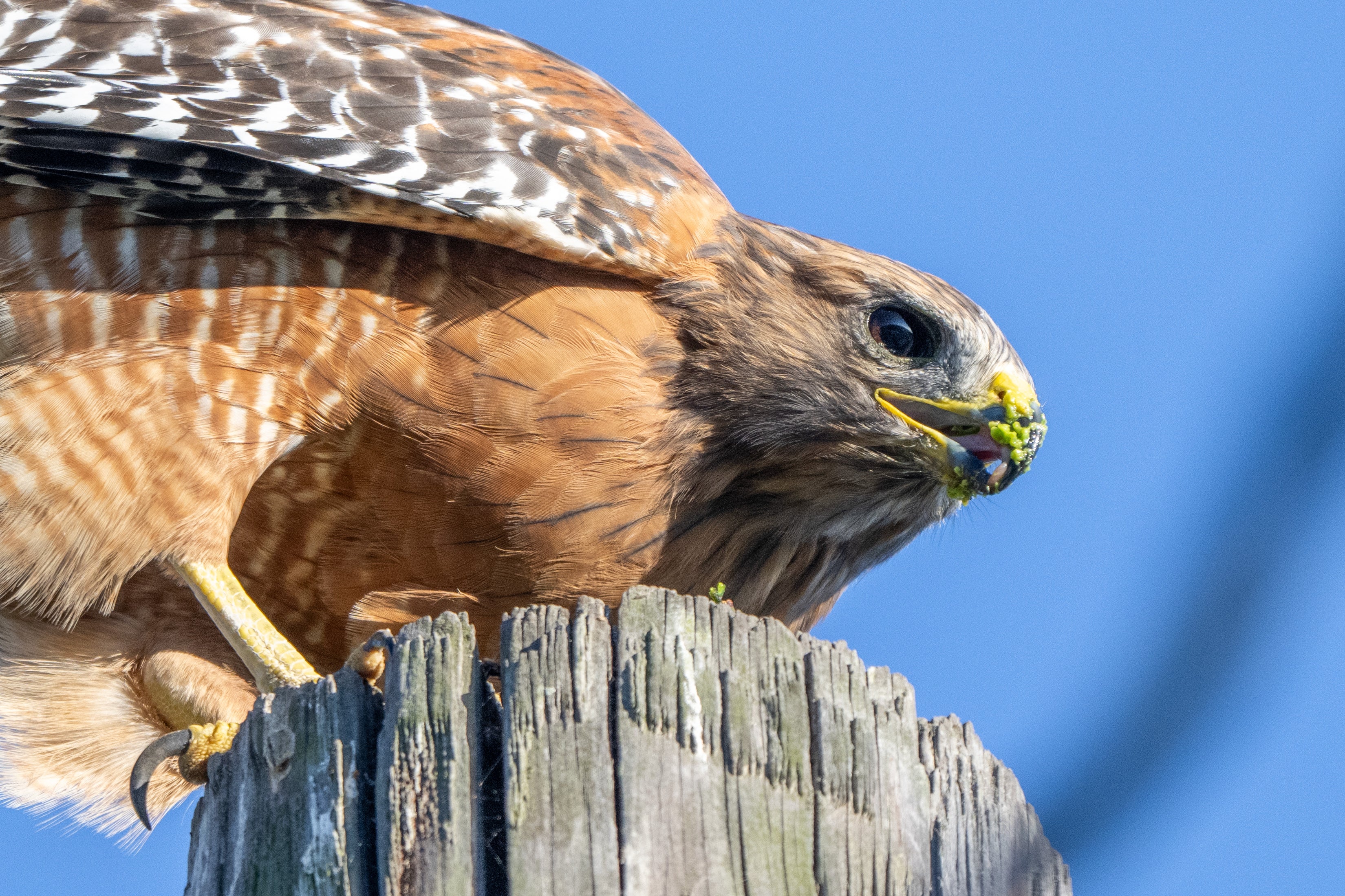 Unbeknownst to the Massons, they were witnessing the first-known observation of a Red-shouldered Hawk eating avocado—or any fruit, for that matter. But it wasn’t the last: They saw the same behavior four times over the next four years, managing to record it twice. The pair disagree on whether they observed the same bird each time—according to Elona, there were differences in the feather coloration from visit to visit—but the food of choice was undeniable.