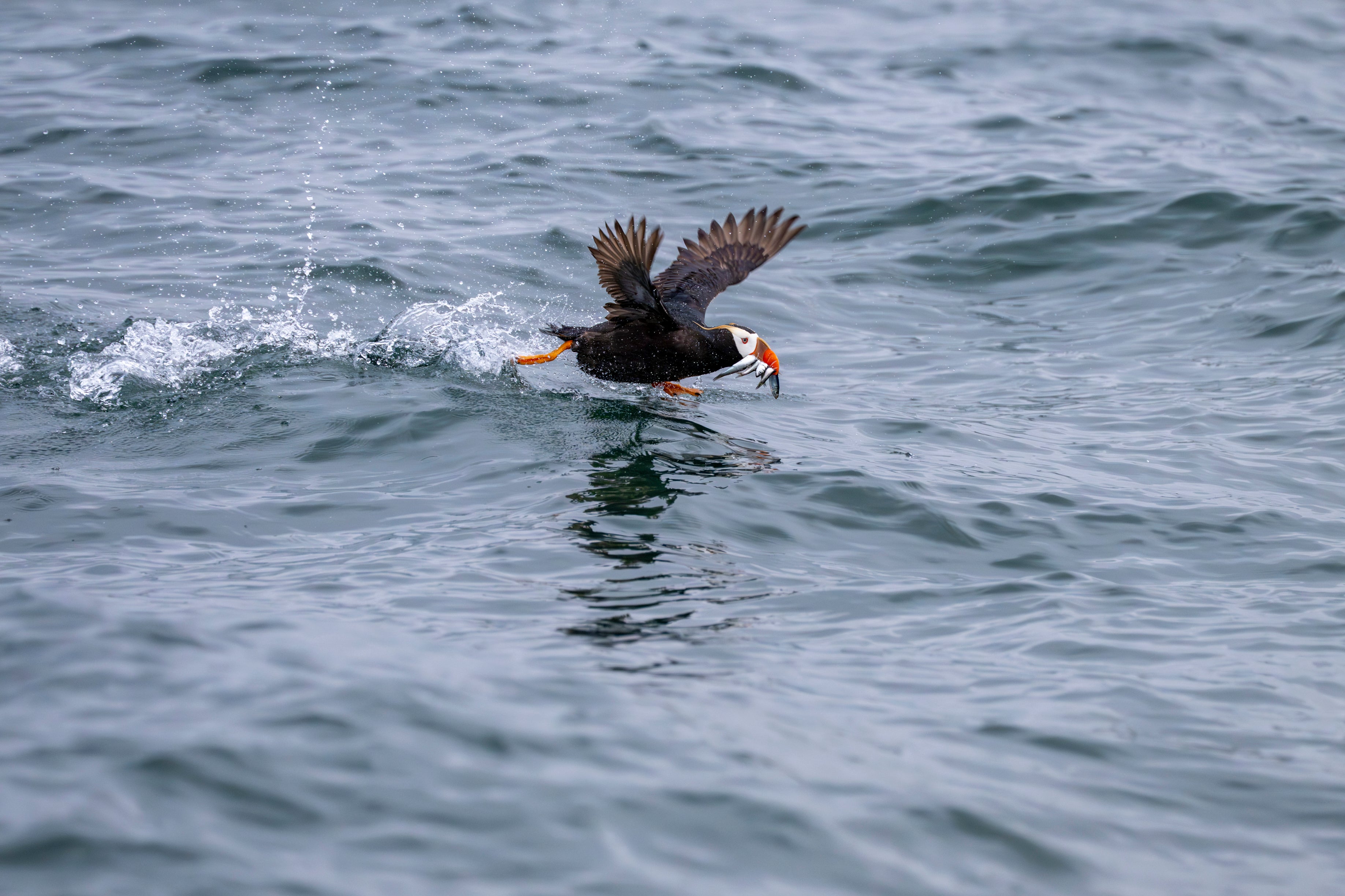 Tufted Puffins are hardy mariners. At about a foot tall, they tower over their Atlantic cousins and are heftier than Horned Puffins, which inhabit many of the same waters but primarily breed farther north. Compared to these other puffins—as well as guillemots, murrelets, murres, and other members of the auk family—they also spend the most time far out at sea.