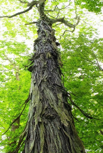 This medium-sized tree is also known as Shagbark, Carolina, Scalybark, Upland, or Shellbark Hickory. It is a deciduous, perennial tree averaging 70 to 80 feet in height, and 12 to 24 inches in diameter. It is probably the most distinctive of all the hickories because of its loose-plated bark. This tree produces thick-shelled, edible nuts, and its foliage turns golden in early fall. It grows in full sun to shade, preferring dry to moist, well-drained, fertile soils.