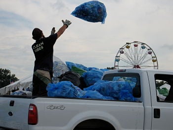 “Every year we try to take little steps on improving the existing green programs we have, and take big ones in starting up new ones,” says Laura Sohn, the sustainability coordinator for Superfly Productions, who has been working on the Bonaroo music festival for four years. For the ninth year in a row, Superfly has contracted the event waste and recycling group, ‘Clean Vibes,’ which recruits an army of five to six hundred volunteers to help in the effort. This year many of them, dubbed “trash talkers,” will be helping patrons divert recyclable materials and trash into their proper receptacles in the area known as Centeroo.