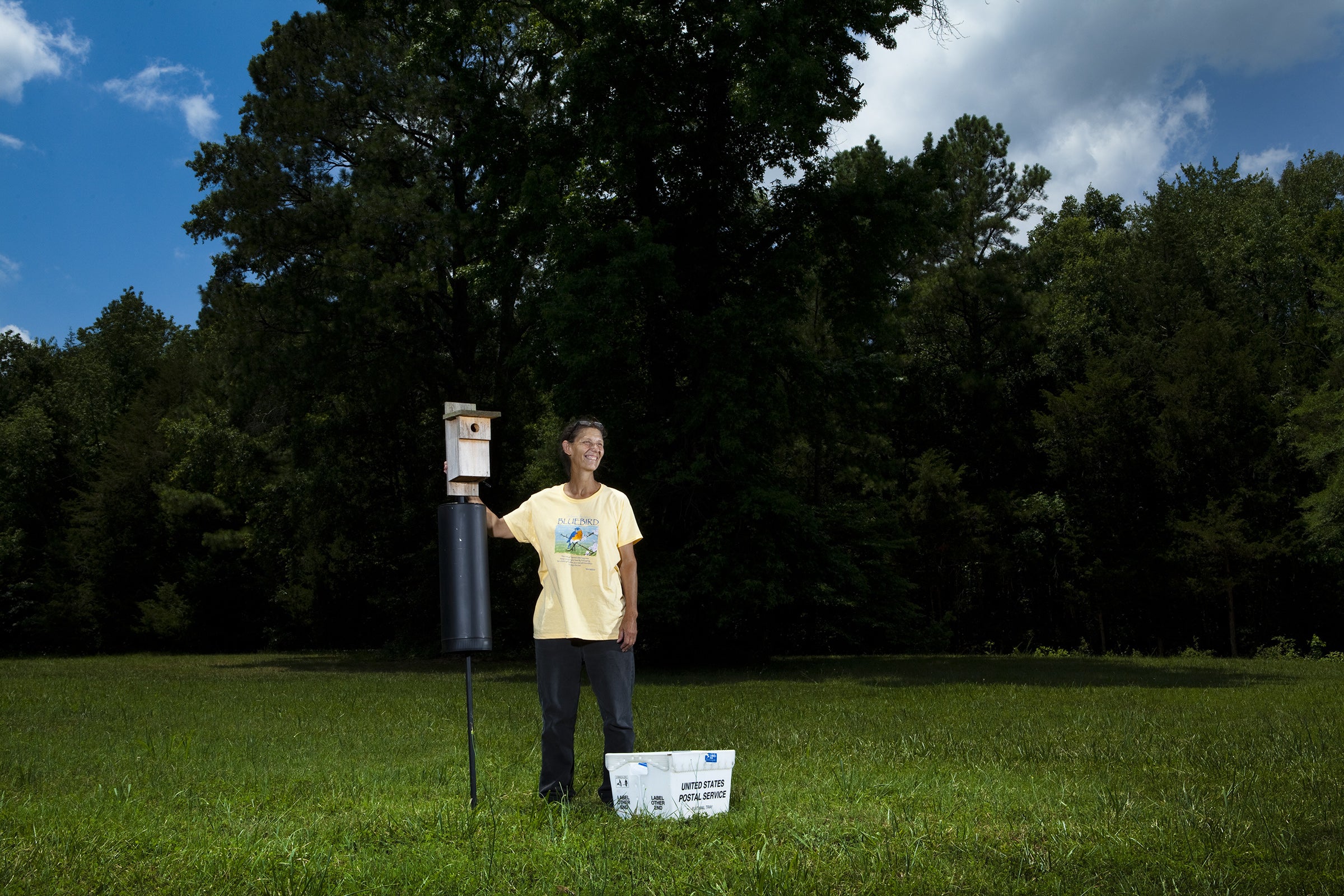 But there have been challenges. Rita's mail route runs along the James River, home to many black snakes. Inevitably, snakes found their way into the bluebird boxes. Not a good thing for bluebirds. She won't kill a snake, mind you—her parents raised her to respect all wildlife. So what was her solution? Rubbing Vick's Vapo-Rub on the base of the pole. Snakes, it seems, have no taste for Vick's.