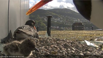 The pair and chick, with a view of the outskirts of Bergen, from http://tjeld.uib.no/