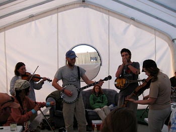 It's a jamboree--plenty of John Prine, the Beatles, and more...oh, and the music is written on the floor in permanant marker.