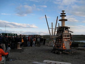Everyone gathers around the unique Solstice bonfire.