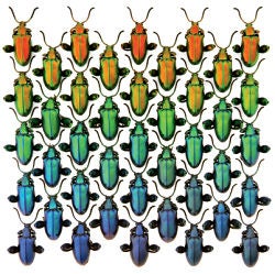 ![]() “Sagra Spectrum” illustrates the stunning color variation that can be found in a single species of frog-leg beetle, from Thailand and Indonesia. Design by Christopher Marley/Photo by Lynn Howlett/Copyright by Pheromone. |