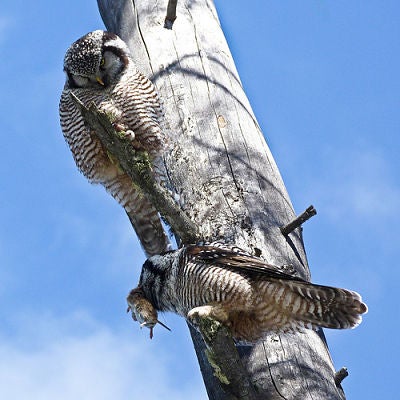 D, all of the above. Weasels, fishers, and martens will kill hawk owl fledglings. Northern goshawks and great horned owls also attack adults of this species; in fact, at least one study showed the latter going after adults roosting at night. “To avoid predation, the Northern Hawk Owl flattens its plumage and stands erect,” according to the University of Michigan Museum of Zoology Animal Diversity Web. “Also, it attempts to intercept predators that attack its nest.”