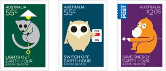 Australia Post and WWF-Australia encouraged people to take part in this year's Earth Hour with a commemorative set of three stamps, each featuring an animal familiar to Aussies--a possum, an owl, and an orangutan--along with the messages "Lights Out," "Switch Off," and "Save Energy." From WWF-Australia.