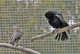 ![]() A brown-headed cowbird female, left, being courted by a male, right. A new study suggests females prefer less flashy and intense displays during courtship. (Photo courtesy Adrian O'Loghlen) |