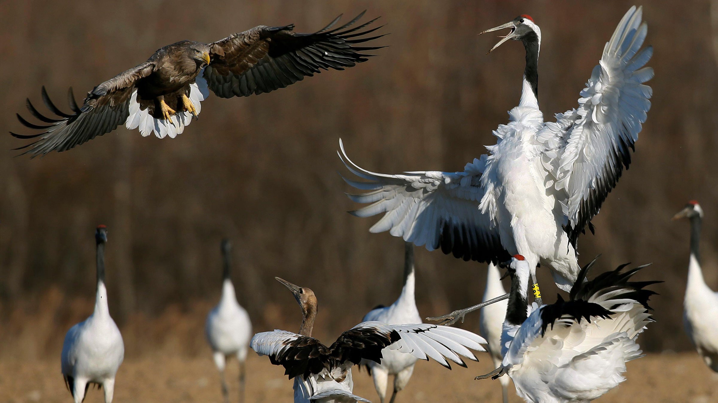 Cranes may be a symbol of peace, but they know how to defend themselves when threatened. The Red-crowned Crane above is employing a classic defense—puffing up to look as large as possible—to fight off the White-tailed Eagle who's after its food.