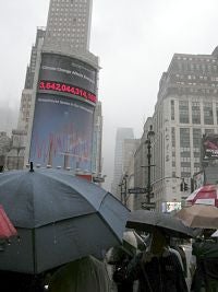 Huddled under umbrellas outside of Madison Square Garden in torrential downpour conditions yesterday morning, members of Deutsche Bank’s Asset Management division officially launched the world’s first real-time carbon counter in the heart of midtown Manhattan. Addressing members of the press, the bank announced that they hope the 70-foot digital billboard will serve as a 24-hour reminder of the global greenhouse gas emissions being emitted into the atmosphere on a daily basis.