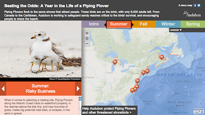 Audubon and ESRI offer an intimate look at what it’s like to be a piping plover with their interactive map story, Beating the Odds: A Year in the Life of a Piping Plover.
