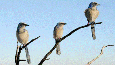 The wind blows constantly across Florida’s Merritt Island, carrying the scent of Atlantic salt into the scrubland and slash pines. The dense palmettos are buffeted together, their rattle adds to the roar of the wind, the scream of the ospreys, and the distant sputtering of motorcycles. Then the low roar is broken by a flash of blue and a bright, rasping call. Perched on a thin oak branch above the palmettos, a jay sways in the wind. He twitches every few seconds, peering around as he shrieks a warning.