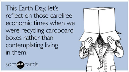 This morning I recieved an email notifying me that a friend had sent me a card, and I admit that my first thought was "Great, it's probably some earnest note that's going to make me feel guilty about sitting in front of a computer instead of being outside planting trees." Happily, I was wrong. Yes, it was Earth Day themed, but it was also hilarious. And a little inappropriate for work, so I won't share the message with you. Head on over to someecards.com to check out their impressive selection of tongue-in-cheek Earth Day cards.