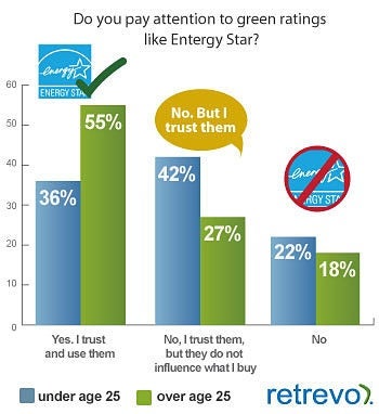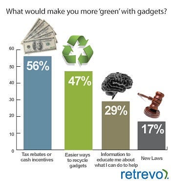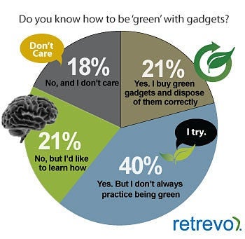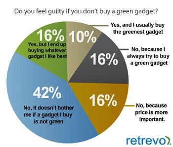 A question for you tech lovers: Do you care if your gadget is green? An independent panel surveyed 1,000 people for Retrevo, a consumer electronics review and shopping site, on consumer interest in green gadgets. The bottom line, according to the company: “It's clear that many consumers get the message about being green with gadgets however in order to get them to put their ‘green’ into action the industry and the government needs to step up and make it easier and worth the effort.” Check out the survey results up top and below.