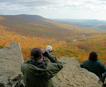Hawk migration watchers at Hawk Mountain’s South Lookout. Author Scott Weidensaul says Edge is the one to thank “every time we watch a hawk circle unmolested in the autumn sky.” Photo from Hawk Mountain by Jim Wright and Kevin Watson. Used with permission of Kevin Watson.
