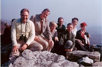 Forgotten woman, but an enduring legacy: Red-hatted Rosalie far right, on North Lookout in 1954 with Hawk Mountain Sanctuary Board. Roger Tory Peterson second from left. Used with permission of Hawk Mountain Sanctuary