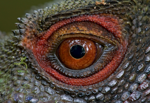 The eye of the Papuan forest dragon (Hypsilurus dilophus), a sit-and-wait predator, scans the forest for insects and small vertebrates. Photo: Piotr Naskrecki