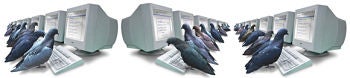 Pigeons are collected into dense clusters where monitors flash in front of their avian eyes. The birds receive search queries and when the monitors show a relevant page hit, the pigeons peck a bar giving that page a PigeonRank value of one. For each page, the points rise and relevancy increases.
