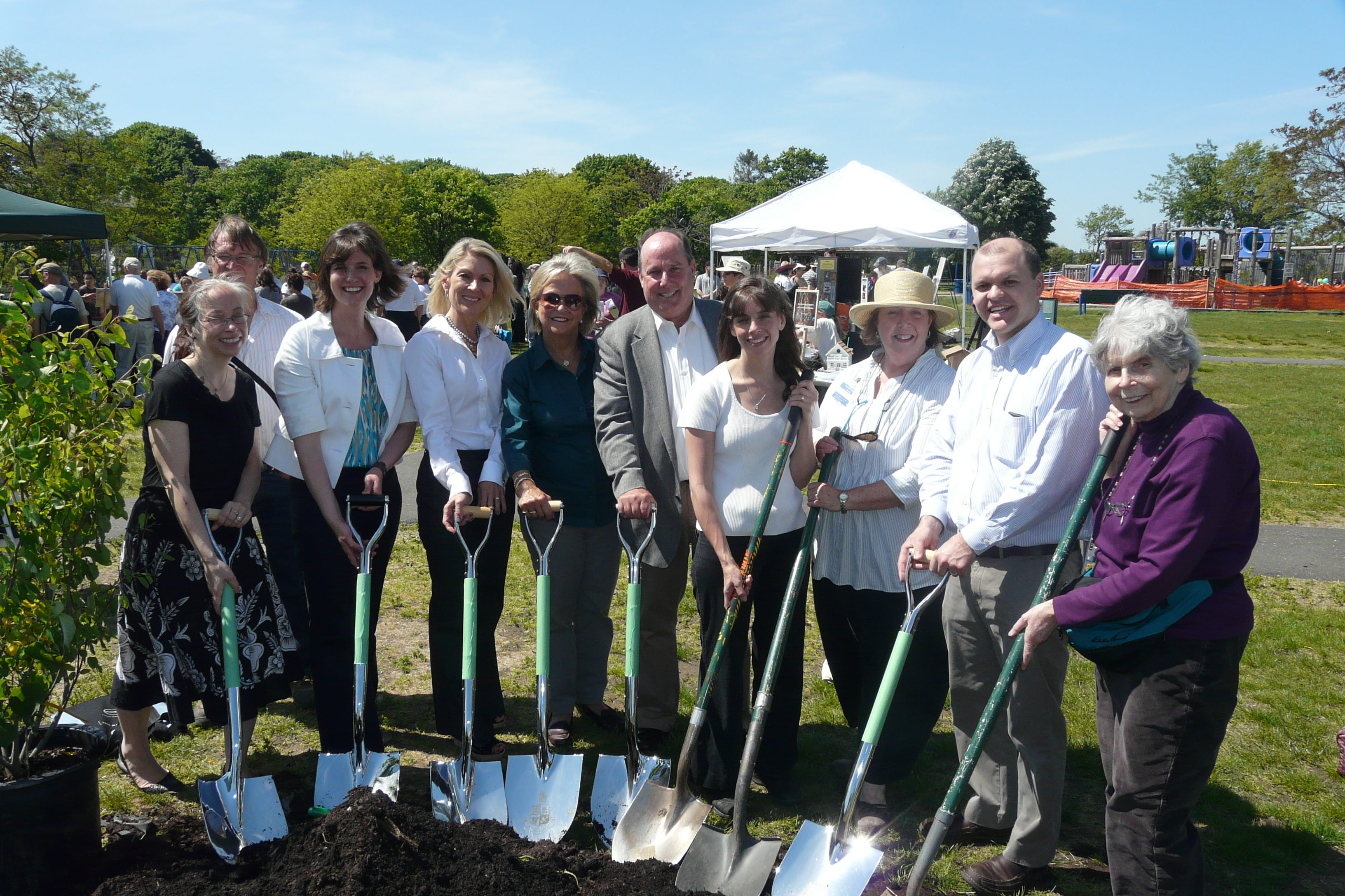 Over 300 children and adults participated in a celebration of birds and ground breaking for the "Urban Oases" wildlife garden at Cove Island Park on Saturday. Audubon Connecticut and the Cove Island Park Conservancy hosted the celebration, which took place on International Migratory Bird Day, and featured live falcons and owls on display, a flying bird show, exhibits, games and nature walks. The highlight of the day was a ground breaking ceremony for a new garden to be planted behind the popular playground area of the park that will provide important habitat for migrating birds. Student representatives from four Stamford Public Schools – Rogers, Stark, and Springdale Elementary Schools and Stamford High School – participated in the ceremony, and will return with their classmates this spring and fall to help install the garden and monitor its success. The ceremony also included statements by Representative Daniel J. Fox, Karen Brown from Fairfield County Community Foundation, Lisa Kovlakas representing the Disney Worldwide Conservation Fund, and Heather Bernatchez, representing Mayor Michael Pavia.