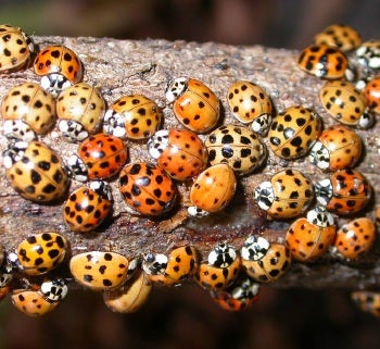 Multicolored Asian lady beetles, or Halloween ladybugs as they’re often called, tend to invade houses at this time of the year. They’re only looking for a nice place to stay warm for the winter. When they find it, they sometimes release “aggregating pheromones,” or odors that attract their kin. Lots of them. The large clusters of this species seen around windows or the corners of rooms tend to spook out housewives and mister moms.