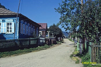 we found a charming collection of old, typically Siberian log homes, two small stores, and a biblioteka (library). It was a hot day, with temperature in the high 80s—not the typical picture (or temperature) that most of us associate with Siberia. The streets were lined with lovely old shade trees. Except for a few Russian made vehicles, mostly beat-up old Ladas, and an ancient tractor, this could have been a bucolic town right out of mid-America, circa the 1940s. The only thing missing from the picture was a makeshift stand with kids selling lemonade.