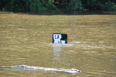 A road sign shows the high water mark in the Morganza Floodway. Photo: Louisiana Department of Wildlife and Fisheries