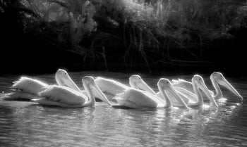 For me, there is no greater pleasure than watching a flock of white pelicans soaring up and up and up in the sky, riding a thermal wind and no funnier moment than watching a flock of swimming white pelicans feed, all bowing down together in perfect synchronization to catch fish. Think Esther Williams with feathers.