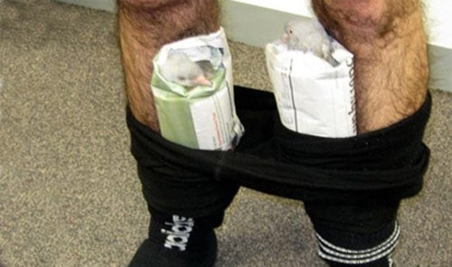 In 2009 cops at the Melbourne airport arrested an Australian man after finding bird eggs concealed in his vitamin case and two pigeons tucked inside a pair of tights he was wearing under his pants.