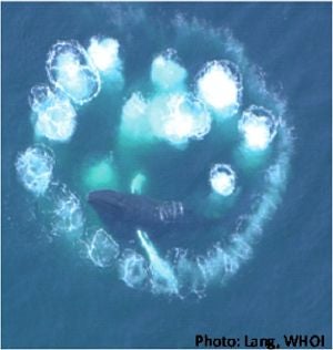 Humpback whales are baleen whales. They take in enormous mouthfuls of the surrounding ocean and then use their baleen to separate out food. Out goes the water, while any fish that happened to be swimming in that very mouthful are now on their way to the whale’s stomach. The fish are tiny and usually swim in schools, such as herring and American sand lance, so the whales get a bigger bang for the their buck when they round them up. Bubbles help them do that.