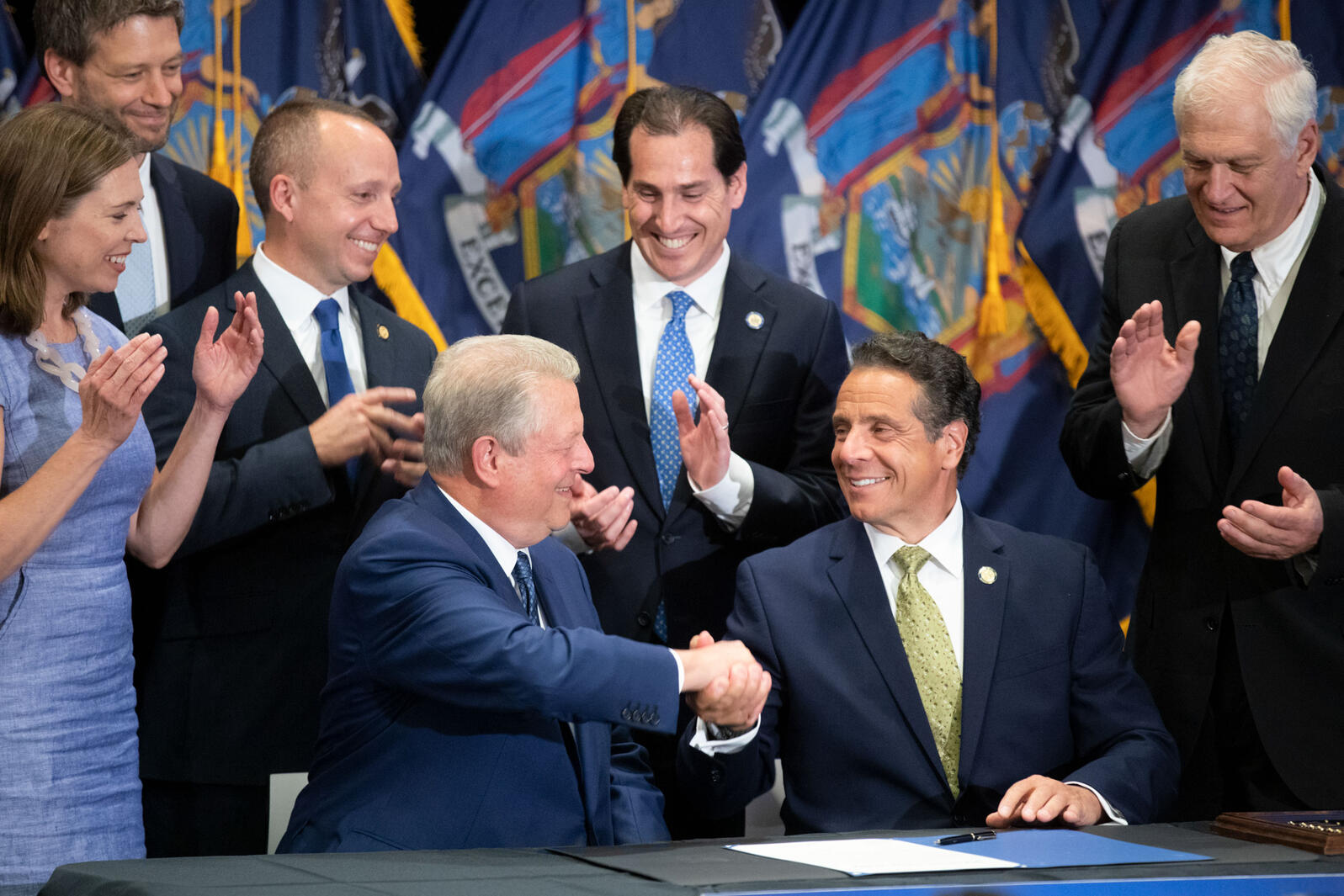 A steady rain was no match for the promise of witnessing history being made as hundreds of people made their way to Manhattan's Fordham Law School, where New York Governor Andrew Cuomo signed into law the landmark New York Climate Leadership and Community Protection Act on July 18, 2019. The event did not disappoint. In addition to a special surprise guest, former Vice President Al Gore, Cuomo signed into law the most aggressive climate legislation in the country and announced the two companies that were awarded contracts to provide 17,000 megawatts of new wind energy to New York State.