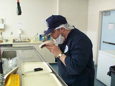 Photo: An inspector from NOAA's Seafood Inspection Program conducts sensory analysis (a smell test) of a sample of fish. Photo courtesy NOAA