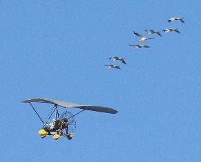| Whooping cranes guided by one of Operation Migration's ultralight aircraft. Photo: Tim Ross |