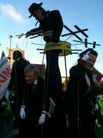 Notably impressive was the presence of homespun brass, marching, and gypsy bands, and Greenpeace's eerie Puppetmaster float, with its representations of climate summit leaders being controlled by lobby money--accompanied by a creepy, slowed-down soundtrack of the leaders' public statements.