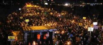 people dancing, and walking briskly in good spirits. When the mass of people reached the Bella Center, where the official summit is being held, demonstrators bought torches made of wax from a group of men selling them from a van, and lit up the night--so as techno-music blasted out from the demonstration's sleek stage, set up for speeches, torches and miniature fires pocked through the massive crowd. For the most part, the demonstration was a positive, family-friendly event. But at the end of the day, there have been a total of 700 people arrested, with injuries reported by protesters and police. A group smashing windows and throwing fireworks in the Stock Exchange district of Copenhagen scuffled with the police,and in response the police swooped in and made hundreds more 'preventative' arrests. Among them might be the kind Danes I'm staying with, who have a baby with them! Let's hope not.